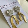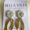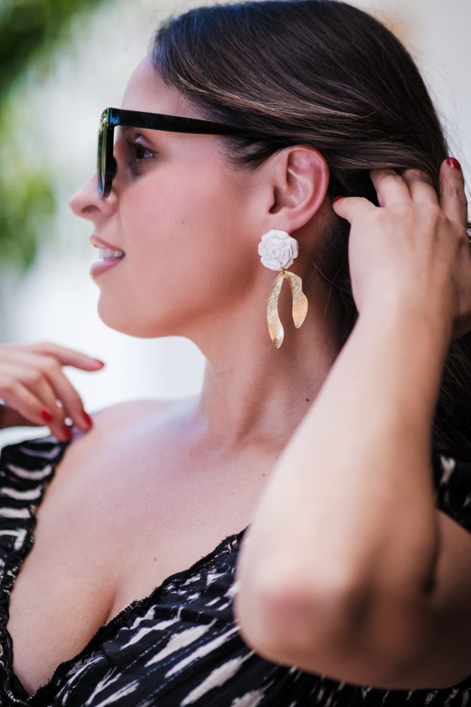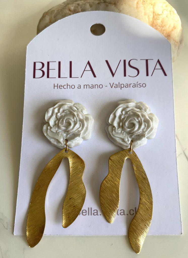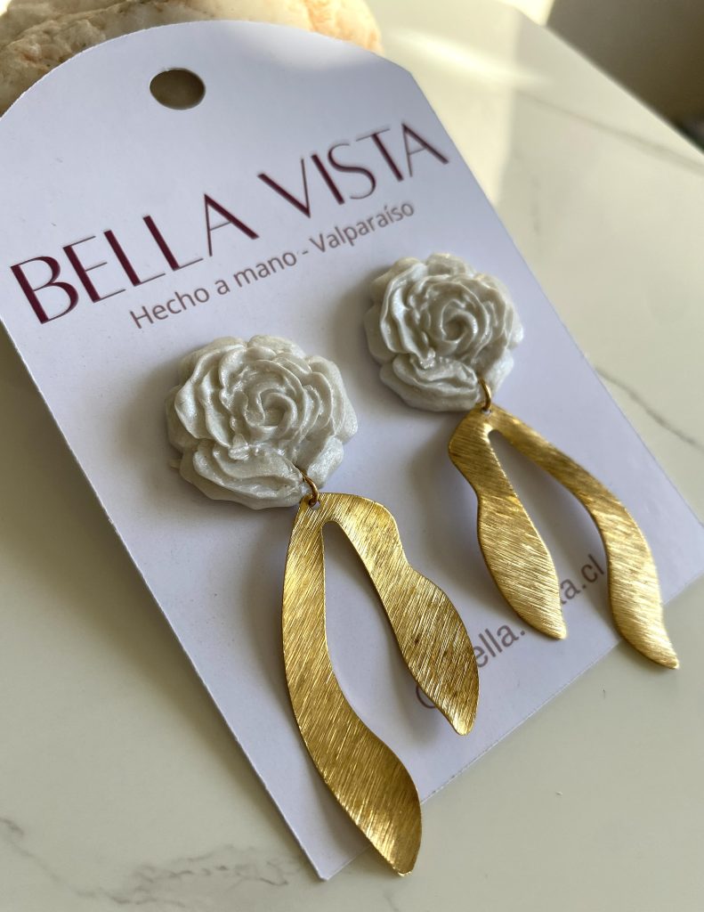 Hecho a mano en arcilla polimérica, comienza con una rosa blanca y termina en un delicado detalle dorado. Un diseño largo, elegante y lleno de encanto ✨