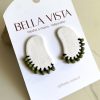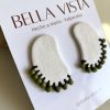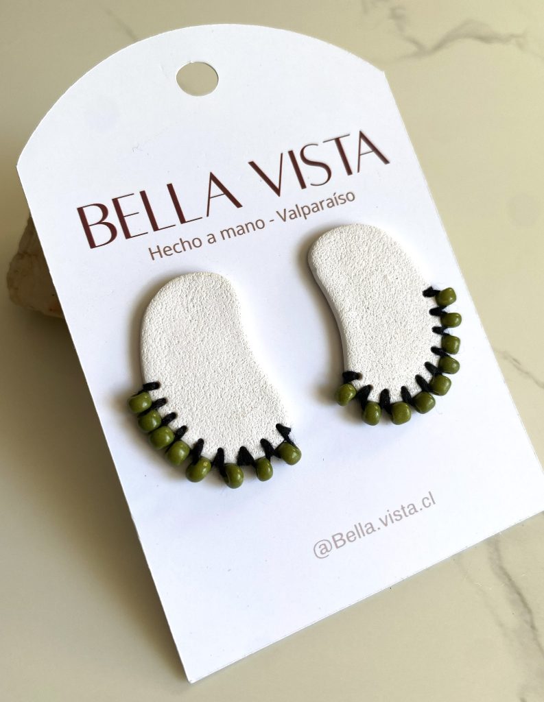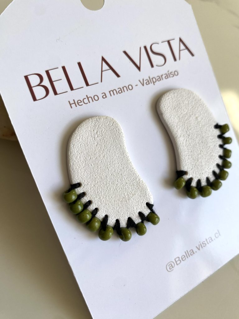 Aritos hechos a mano en arcilla polimérica, con textura suave y detalles de mostacillas verdes tejidas a mano. Un diseño moderno y delicado con toque natural.