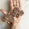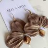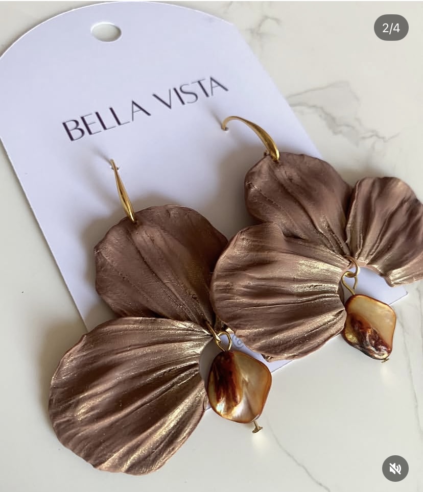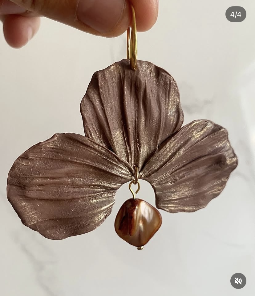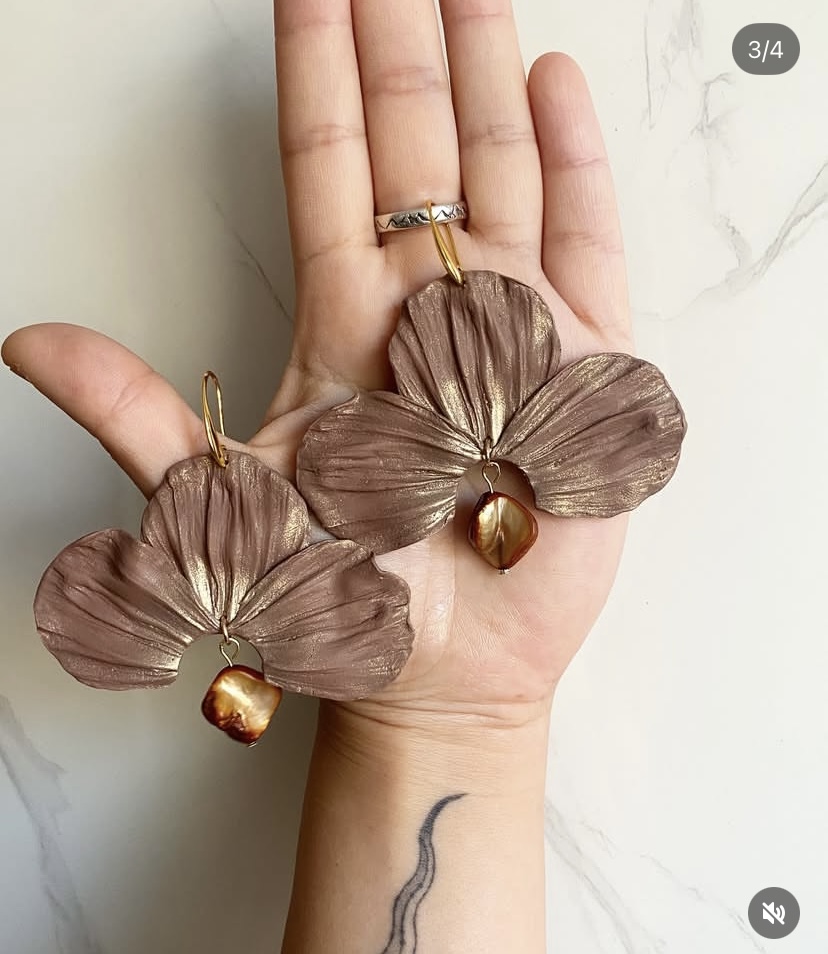 Aros hechos a mano en arcilla polimérica, con forma orgánica y acabado satinado en tonos tierra. Incorporan concha nácar en el detalle central, aportando brillo y movimiento.