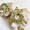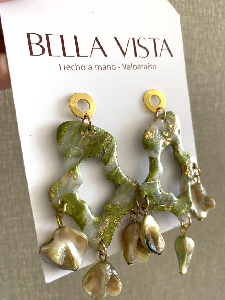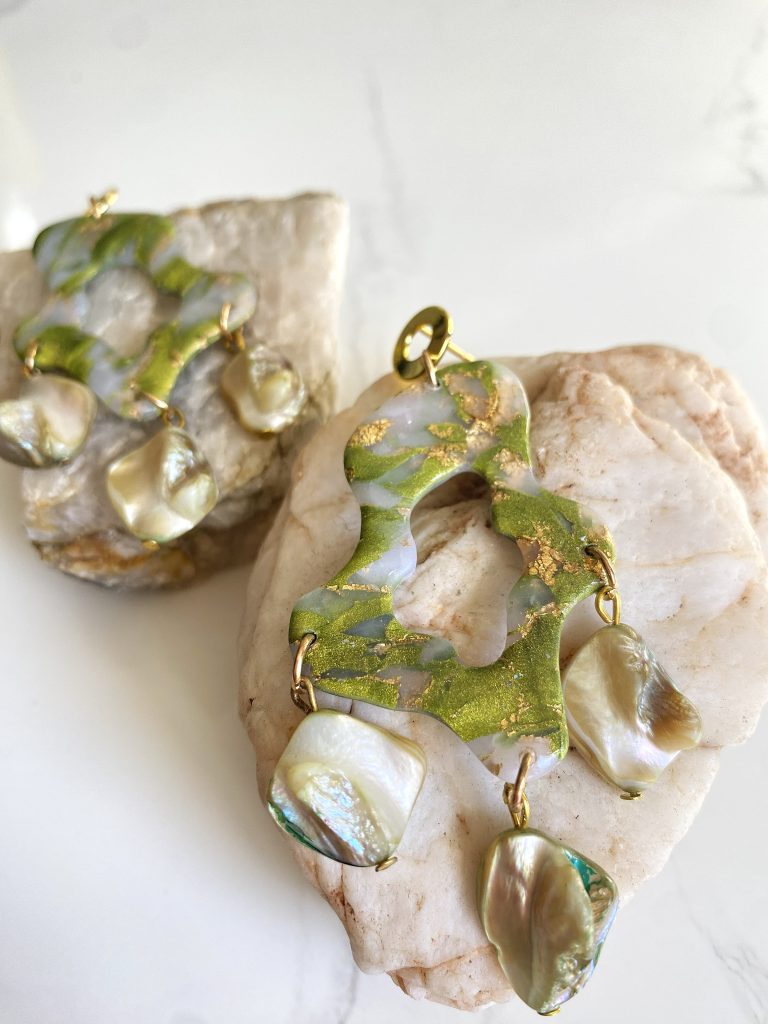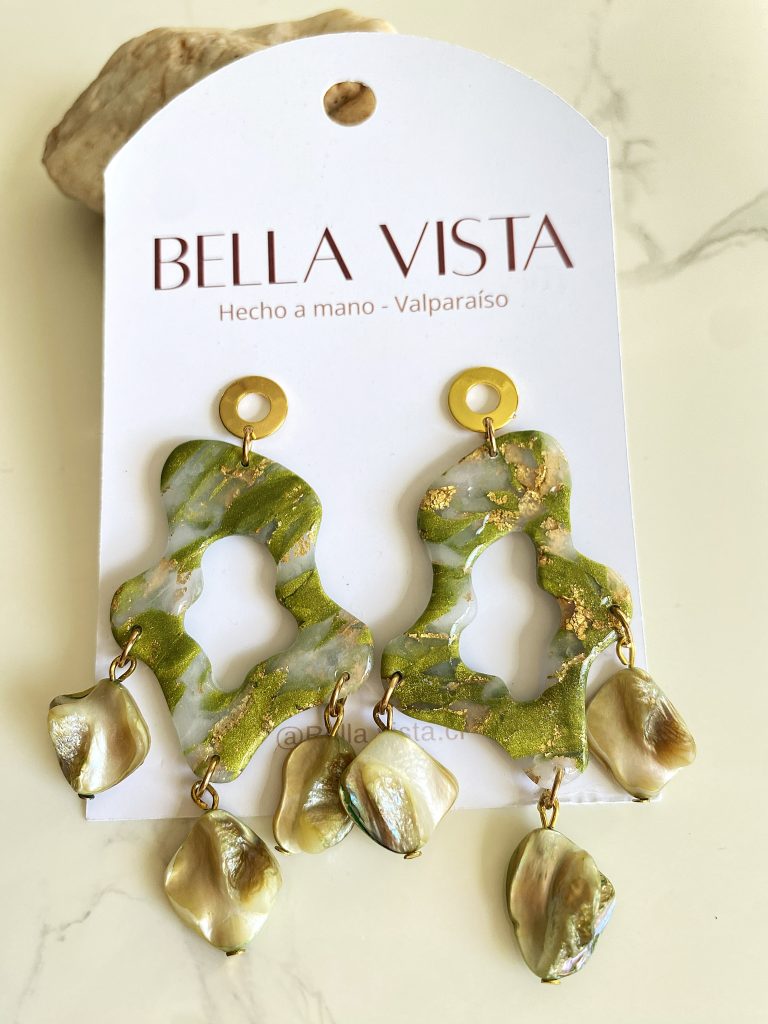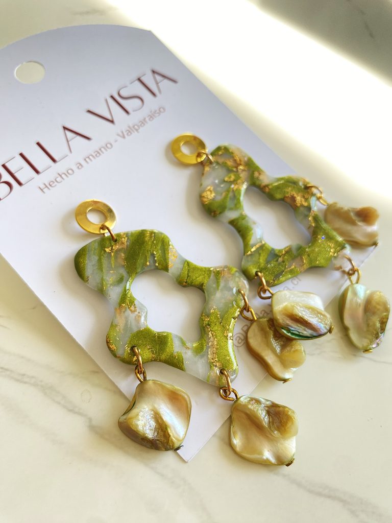 Hechos a mano en arcilla polimérica, con detalles dorados y terminación en concha nácar natural que les da un brillo único.